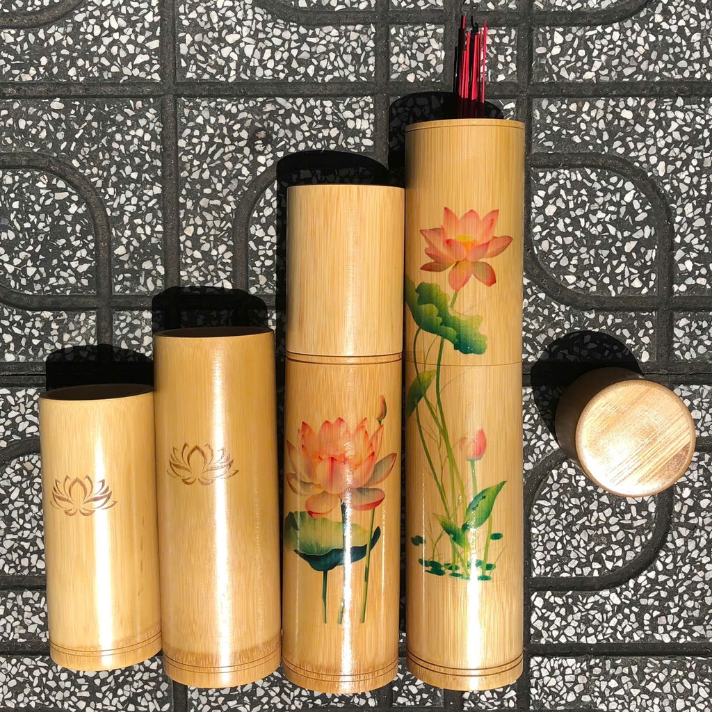 Ống đựng nhang bằng tre - Ống tre cắm nhang đẹp có khắc hoa sen mang đậm phong cách của người Việt Nam. Sản phẩm có thể được khắc sẵn hoa sen đẹp, có thể khắc logo riêng