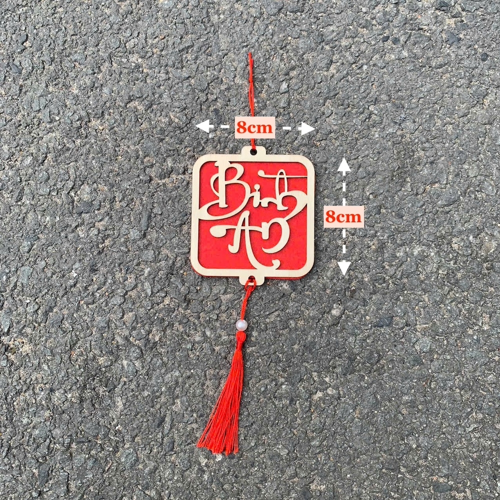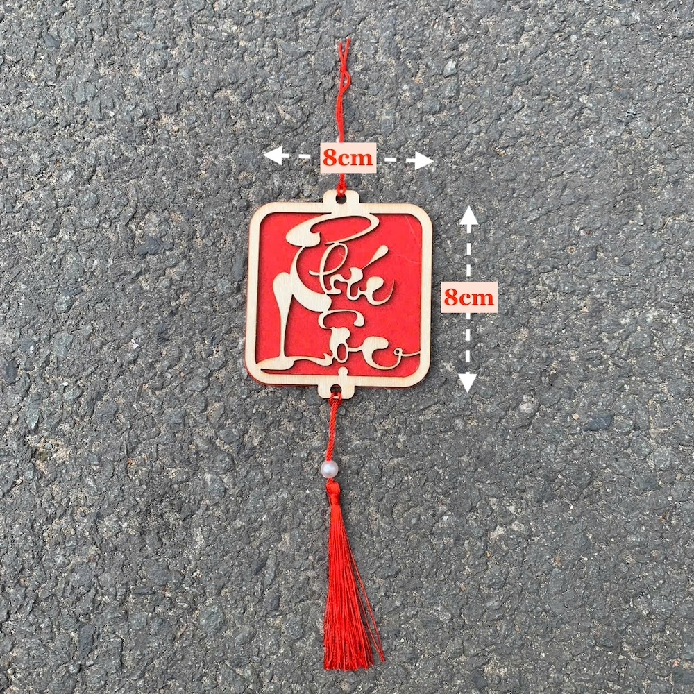- Kích thước: tag gỗ 8x8cm (chưa tính tua rua)