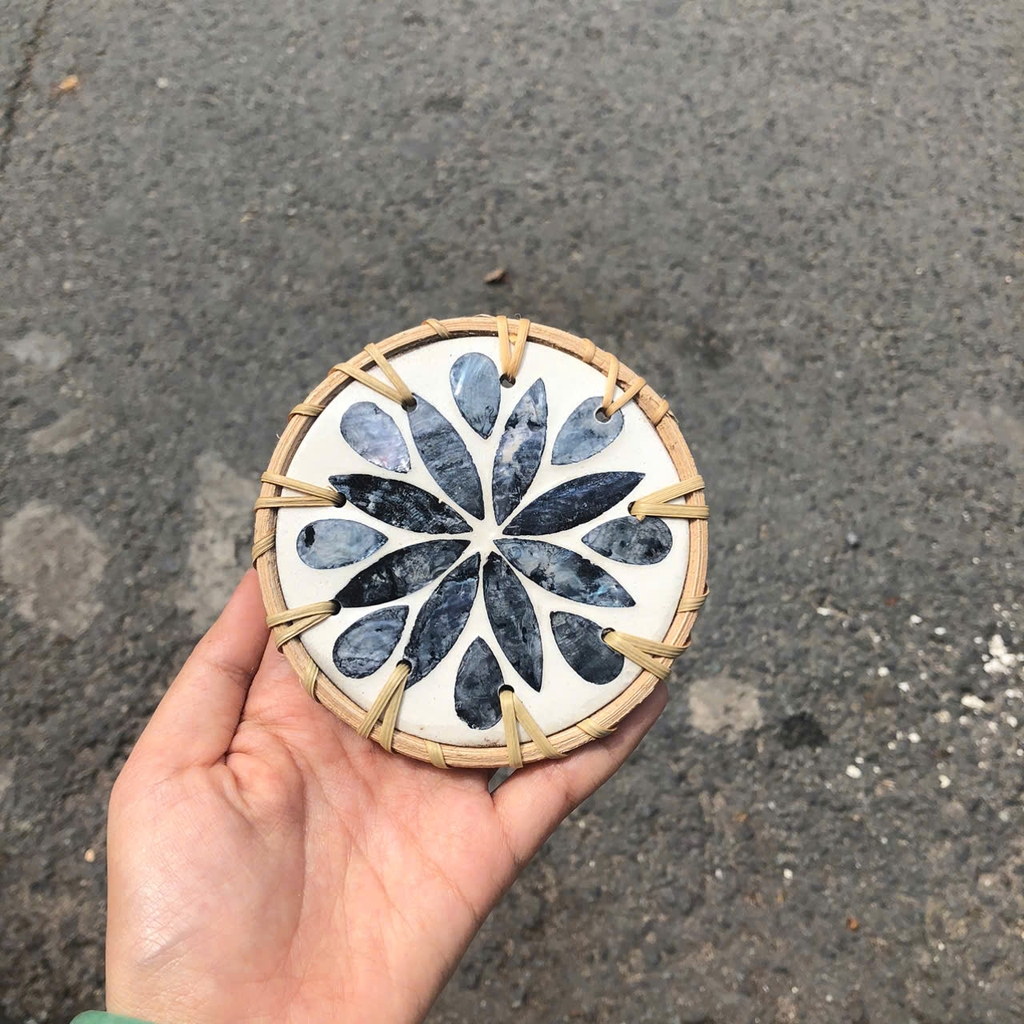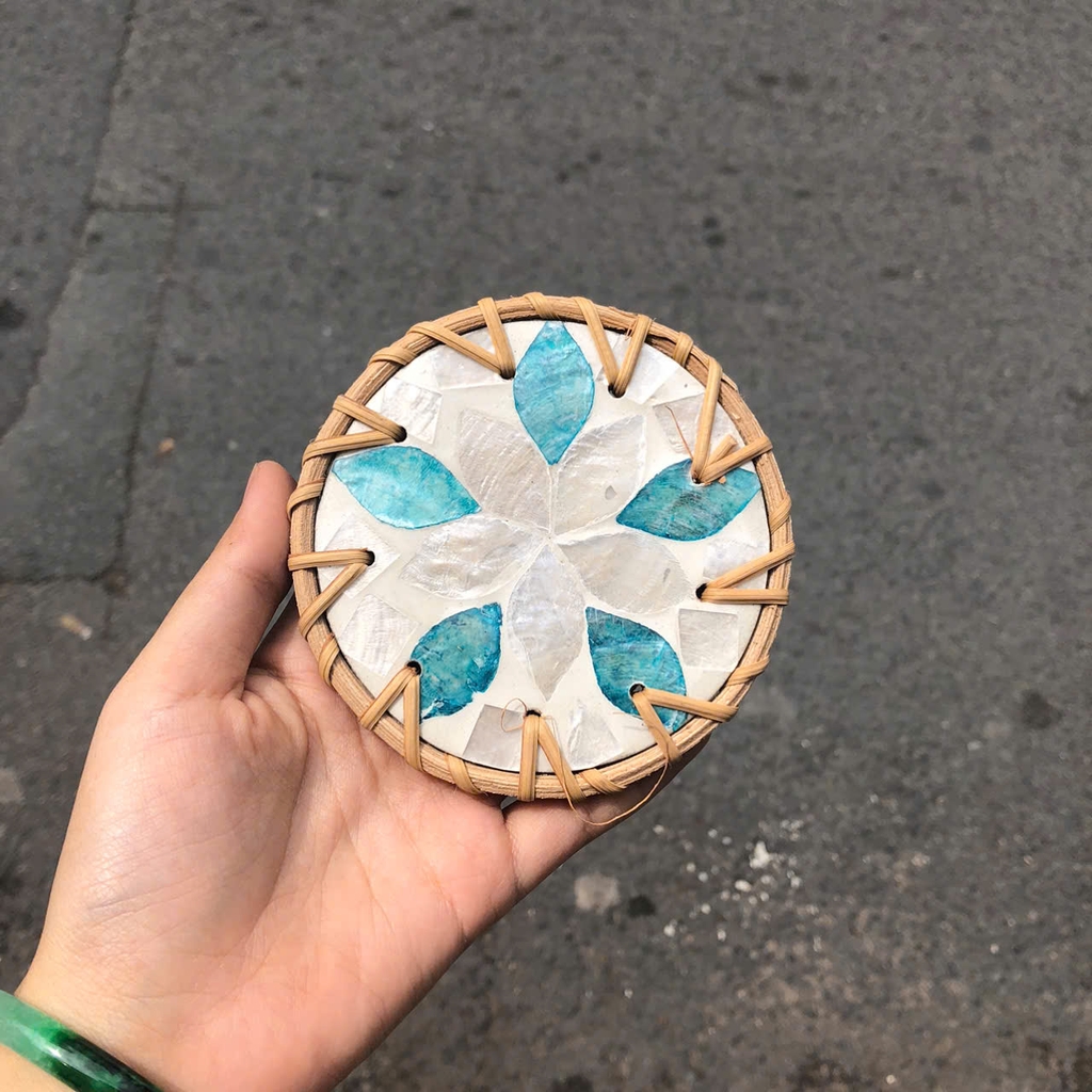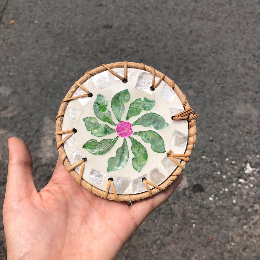 Tấm lót khảm trai viền mây dùng lót ly/ bình hoa/ nồi decor quán nước, phòng khách - Rattan Placemat